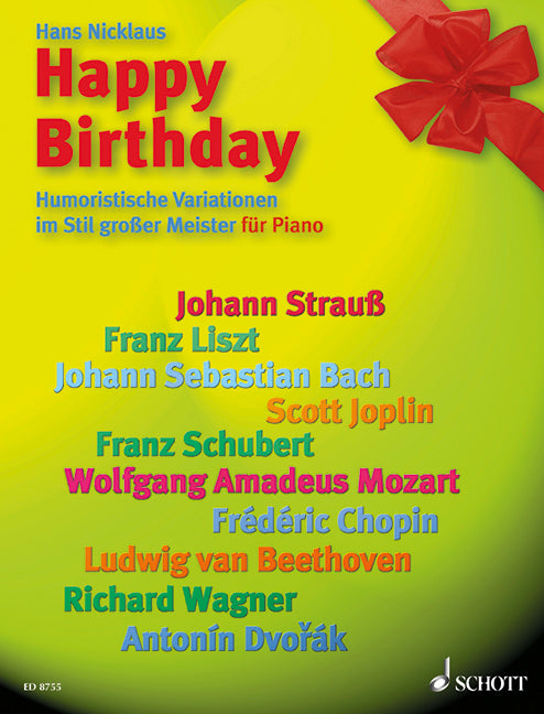 These attractive variations on the 'Happy Birthday' - theme are written in the style of various masters and are suitably flavoured with additional quotes, the 'congratulations' are meant to be by the following composers: Bach, Mozart, Beethoven, Schubert, Chopin, Liszt, Wagner, J. Strauss, Dvorák and Joplin. German birthday poems in imitation of Busch, Goethe, Mörike, Morgenstern, Schiller and Storm complement the music, adding up to a perfect birthday present for the amateur pianist.