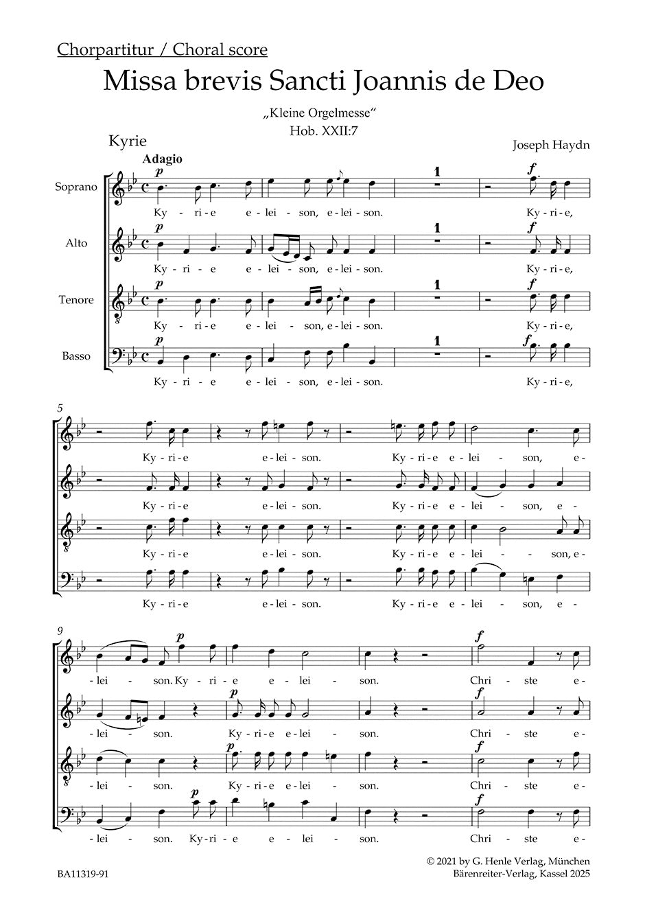 Missa brevis Sancti Joannis de Deo Hob. XXII:7 "Little Organ Mass" (Choral score)